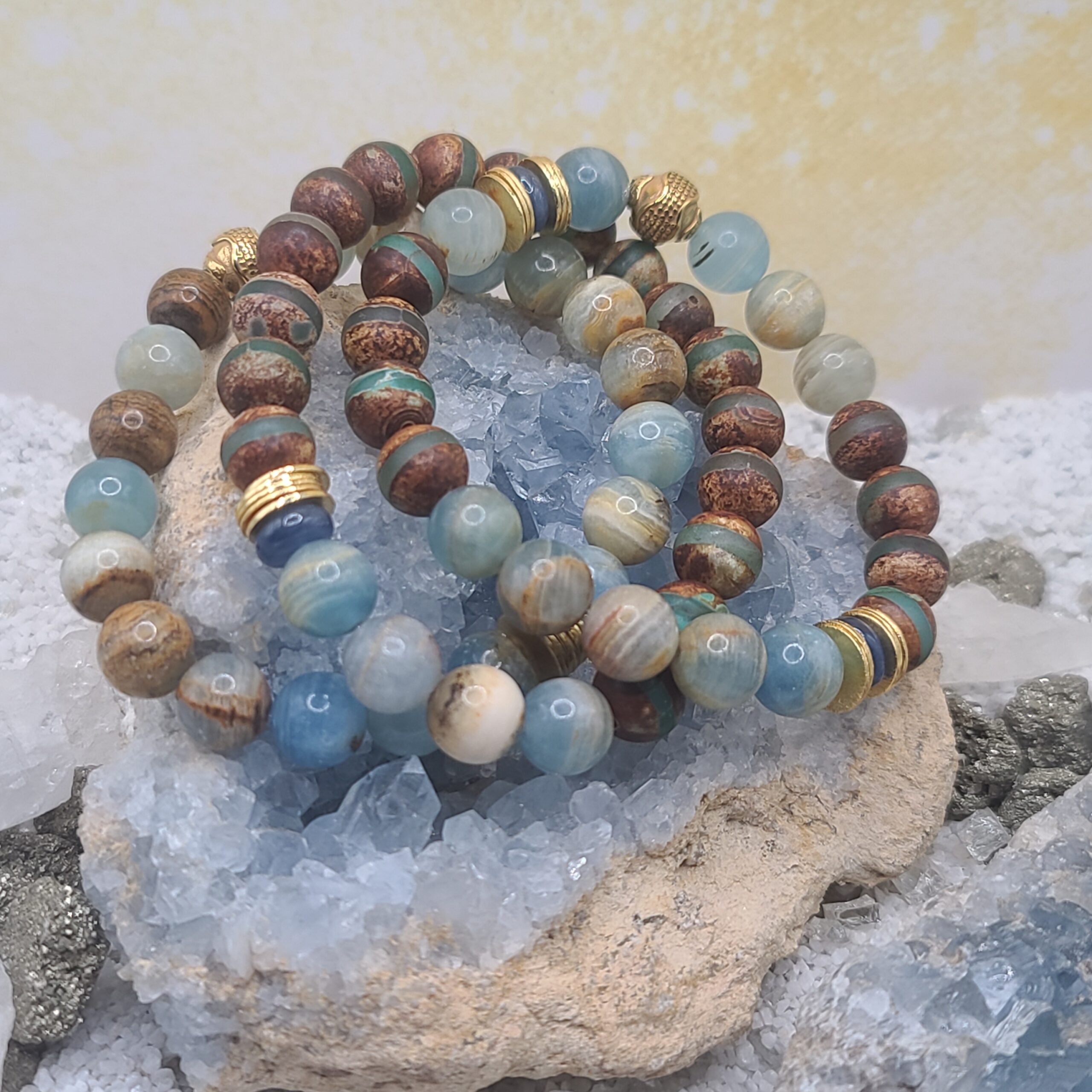 Natural Argentina Lemurian Aquatine Calcite Aka Blue Onyx & Tibetan Agate Trio Bracelet Stack