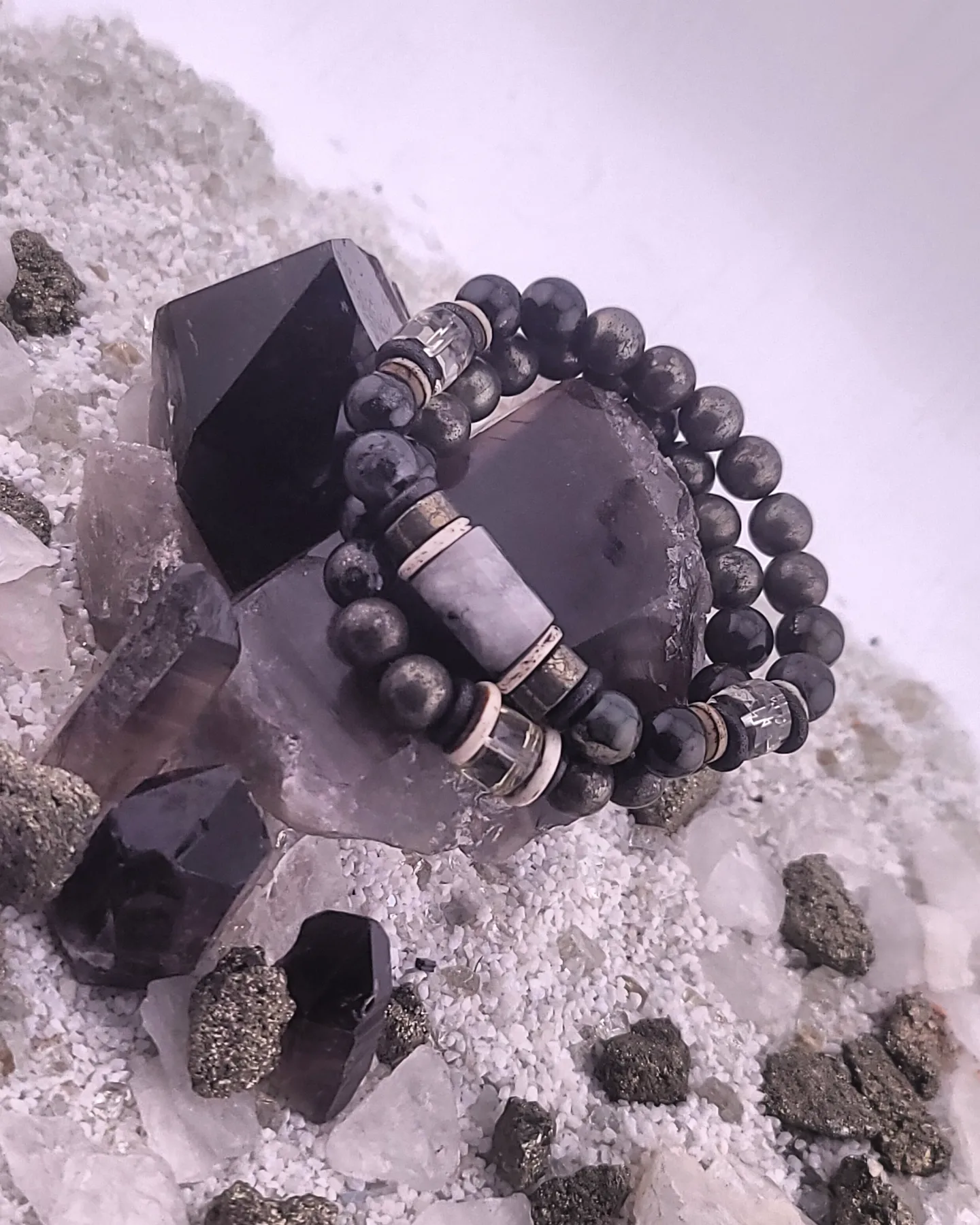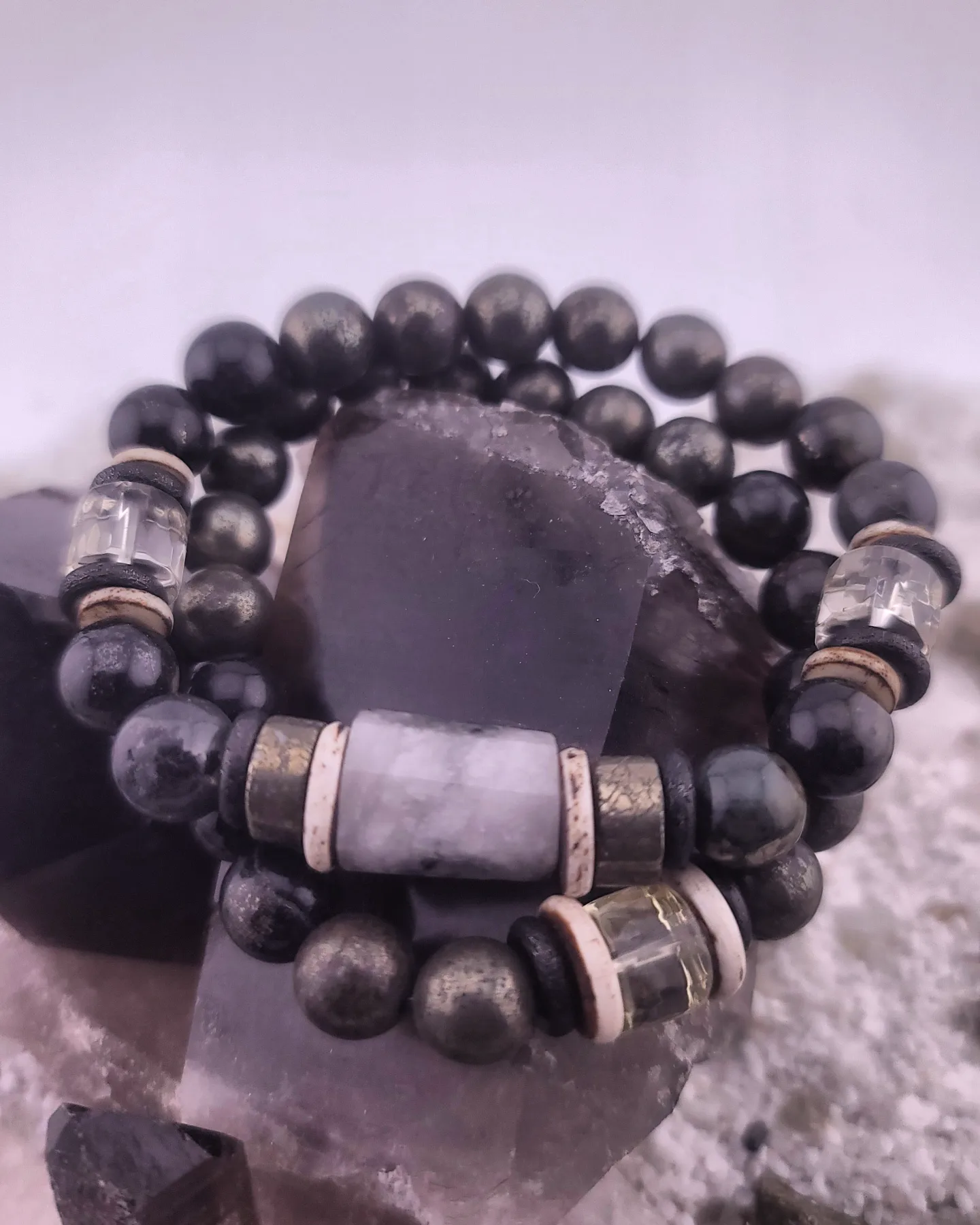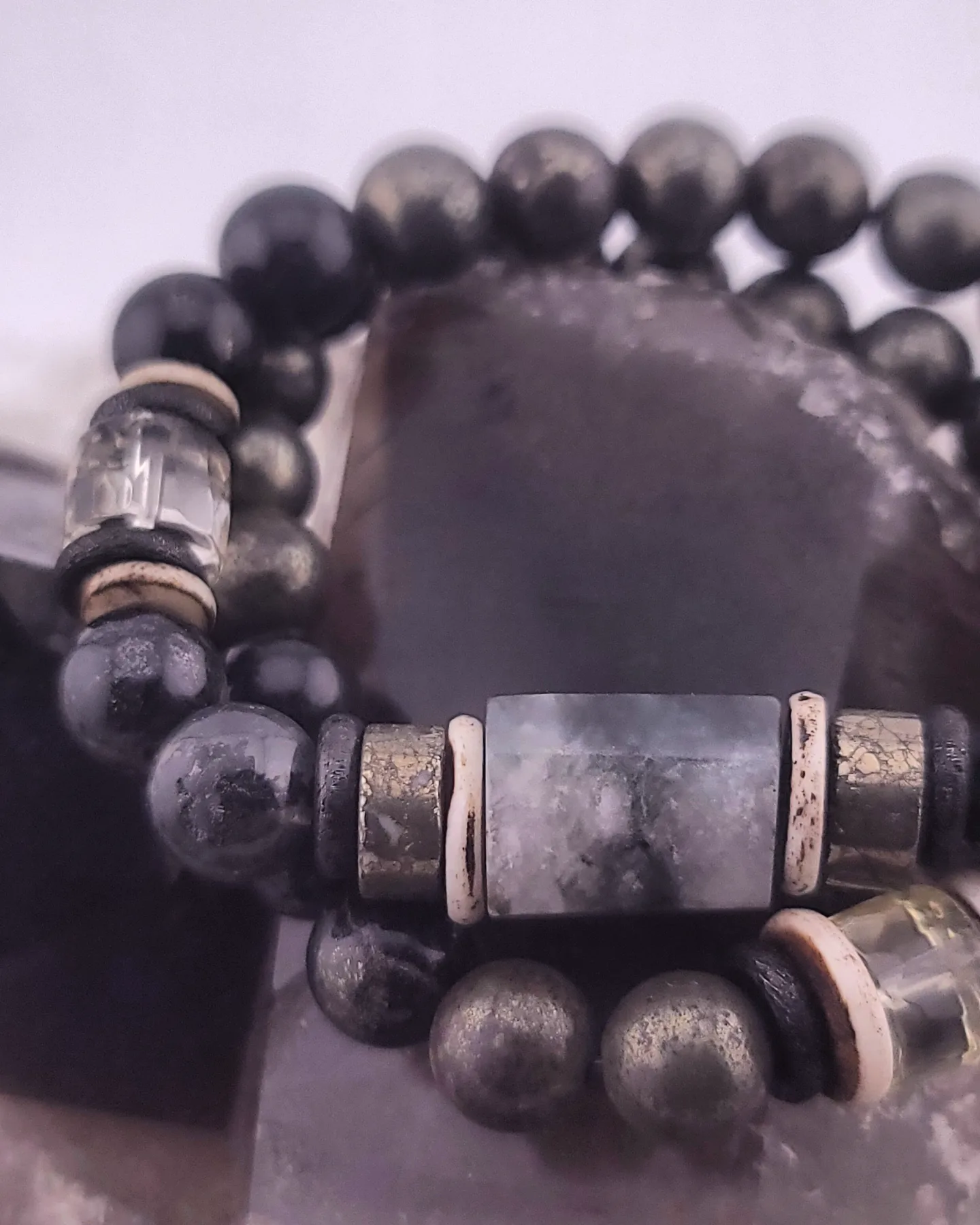 Natural Rare Columbite & Pyrite Bracelet Stack